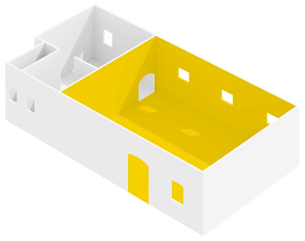 La sala principale è attrezzata con luci, stativi, cavalletti e fondali per la realizzazione di due set in contemporanea. Dispone di una zona magazzino per lo stoccaggio di props e attrezzature, camerino e bagno.